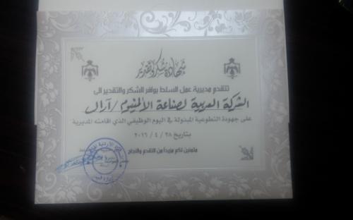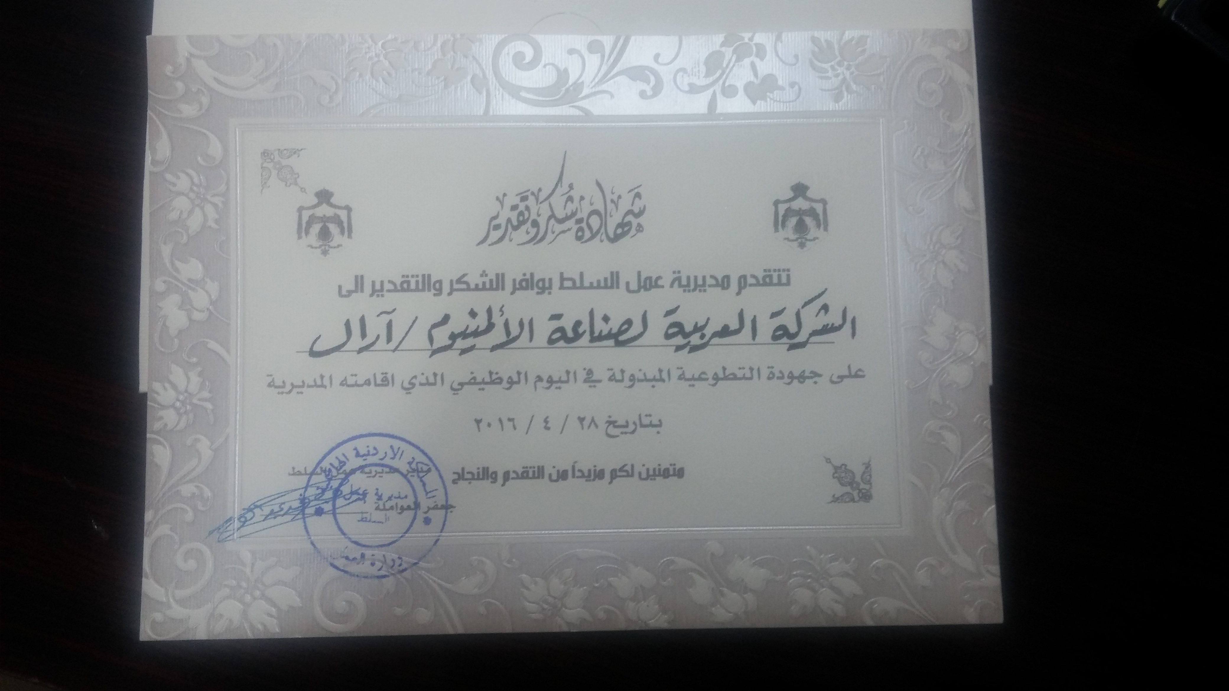 An appreciation letter was given to Arab Aluminum Industry (ARAL) by Action Salt Directorate on 28/04/2016 because of its volunteerism during the career day ocassion