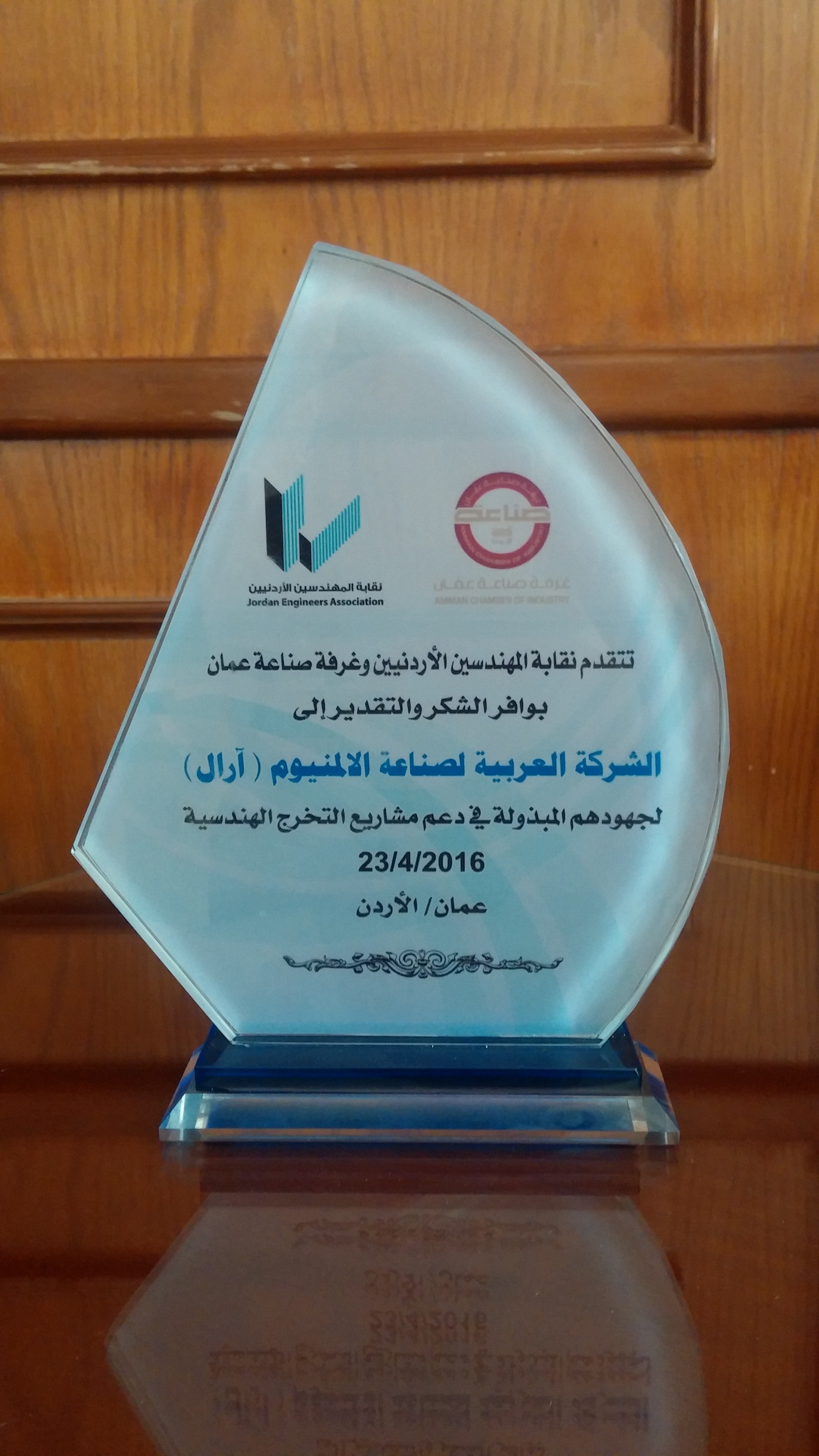 Arab Aluminum Industry Co. LTD (ARAL) was awarded by Jordan Engineers Association and Amman Chamber of Industry as appreciation of supporting engineering graduation projects and sientific researchs, in a cermony that held in Philadelphia University on Saturday 23rd, Apr.2016
