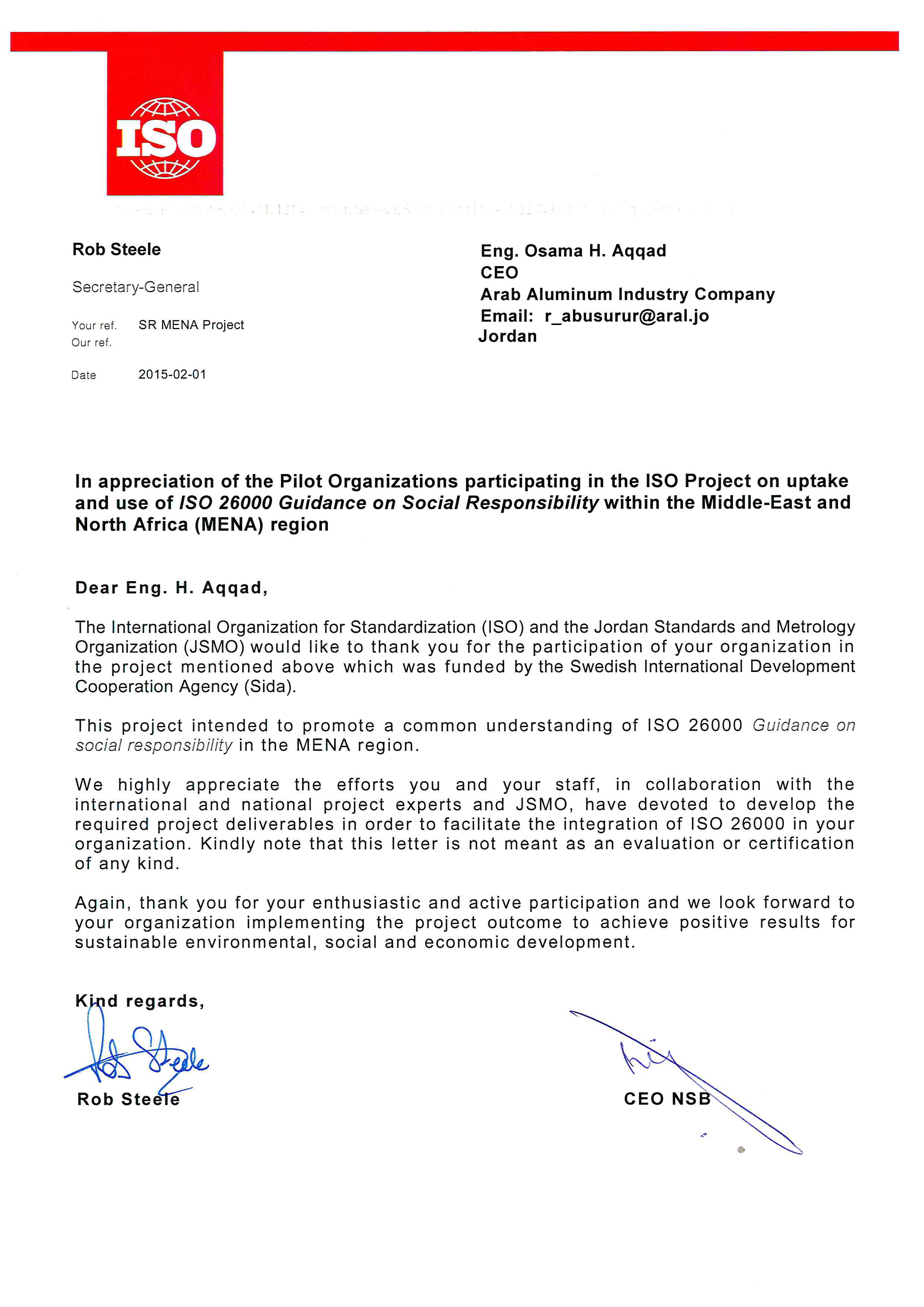 As a result of Aral participating in the ISO project ( the use of ISO 26000 guidance on social responsibility) which were organized by the International organization for standardization (ISO) and the Jordan standard and metrology organisation (JSMO), Aral efforts were appreciated during an Honoring Ceremony held on Thuresday 26th, March.2015 in the (JSMO) main building, by an appreciation letter which was given to the General Manager ( Eng. Osama H. Aggad).