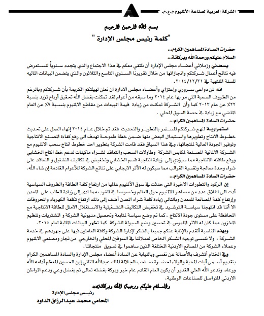 In the twenty-seventh of April the thertiy ninth ordinary meeting of the General Authority were held , the meeting  was initiated with a speech from the Chairman who in turn welcomed the audeince, and talked about ARAL's  achievements ( earnings and results) during 2014 .