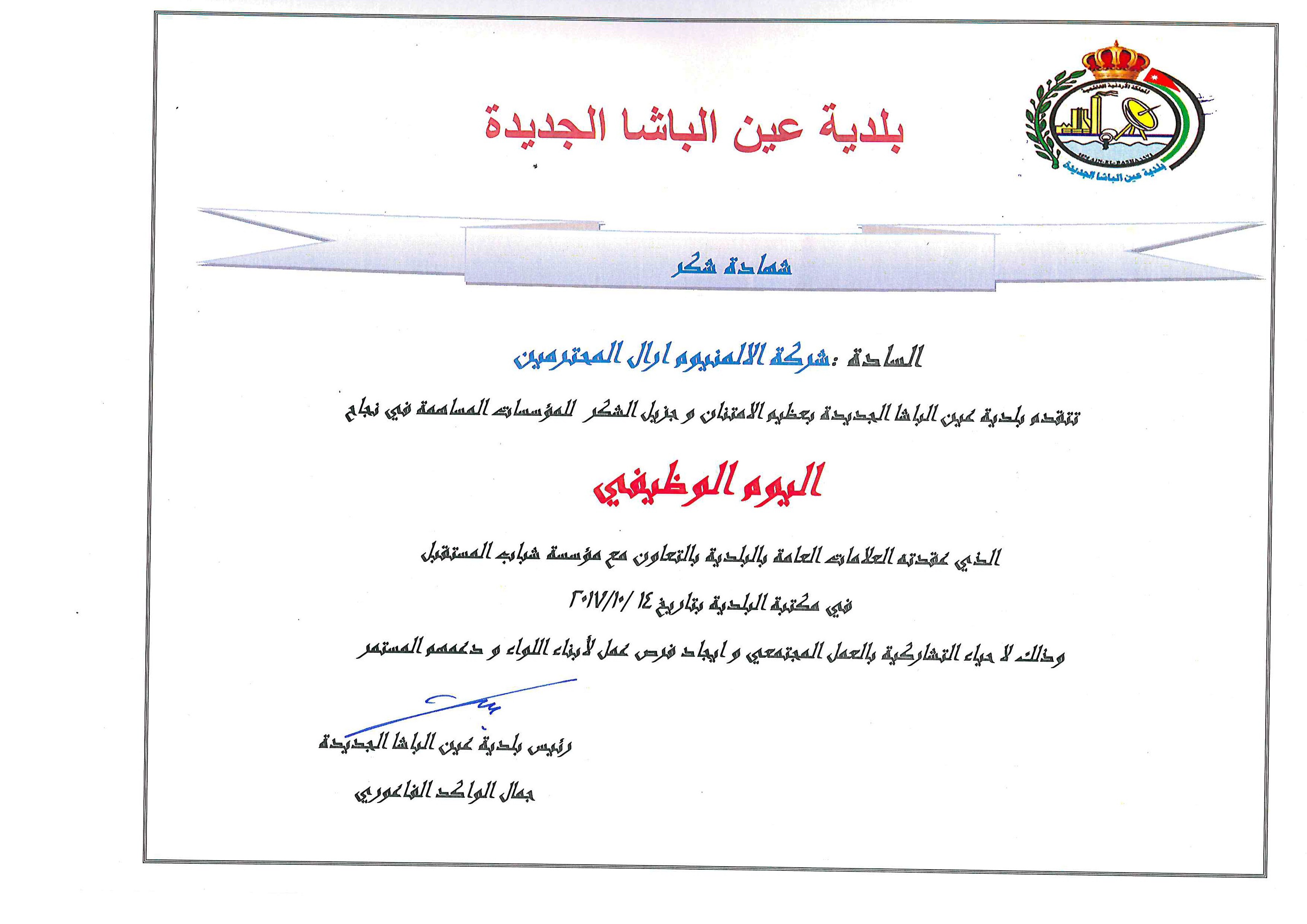 Ain Albasha municipality gave Arab Aluminium Industry Co. LTD (ARAL) Certificate of Appreciation because of ARAL's participation in the career day event that held on 14/10/2017.